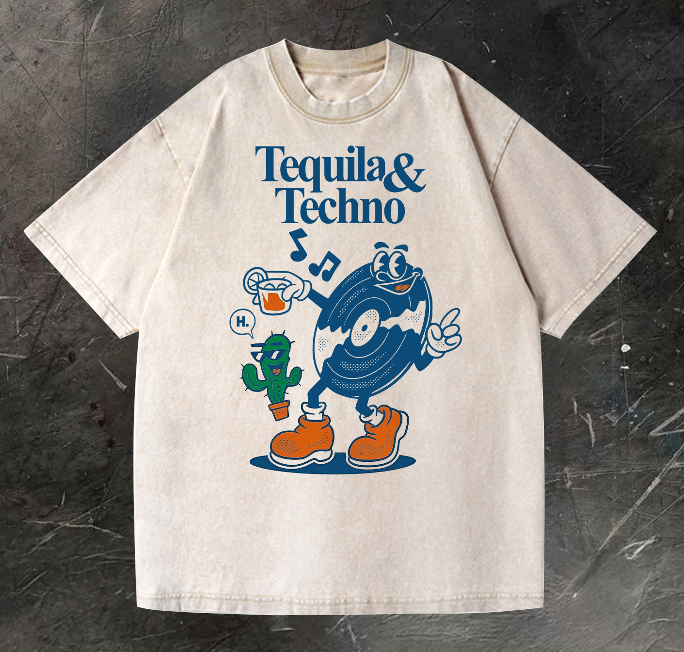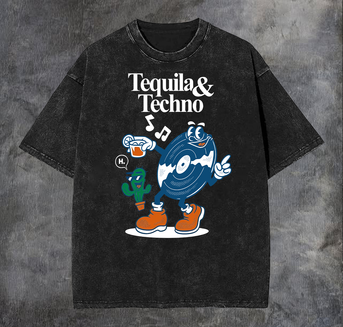 Tequila & Techno Printed Vintage Washed T-shirt(Double-sided Print)